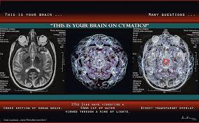 27hz sine wave vibrating a pool of water, lit from beneath, viewed through a ring of lights — directly overlaid on a cross section of the human brain, revealing the geometric congruence between sound frequency and biological structure.